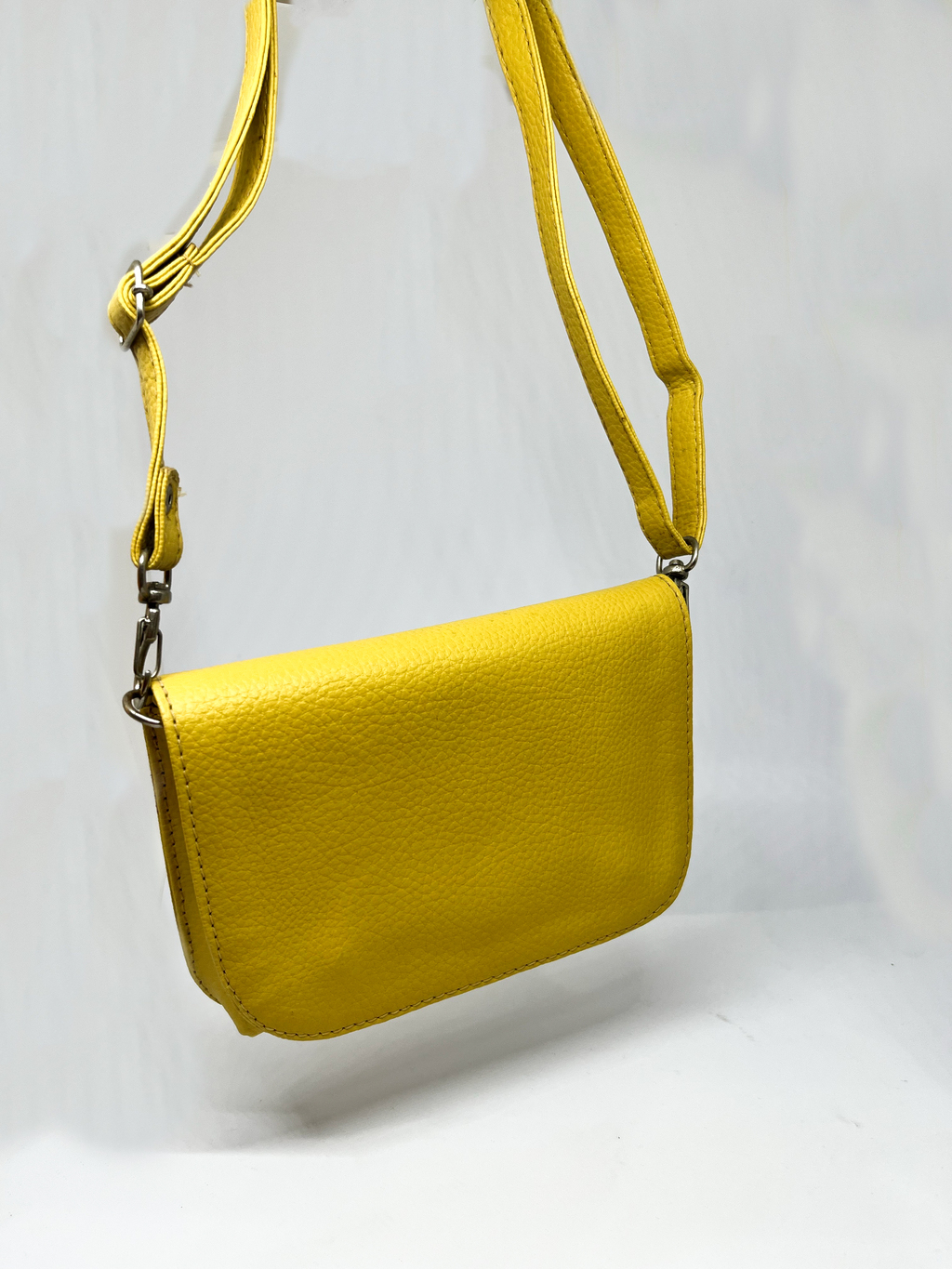 Bolsa na cor amarela, com fechamento de botão, contendo alça removível.